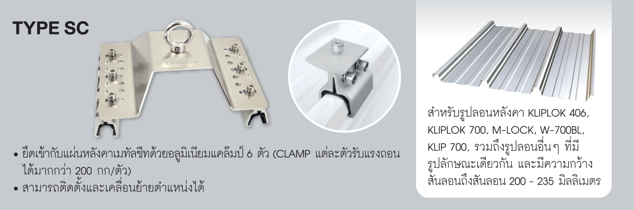 ROOF SEIF® ได้พัฒนาเทคนิคการติดตั้ง Anchor Device เข้ากับแผ่นหลังคาเมทัลชีทโดยใช้ Aluminium Clamp ซึ่งสามารถติดตั้งได้โดยไม่ต้องเจาะแผ่นหลังคา ช่วยลดความเสี่ยงเรื่องการรั่วซึม โดยมีคุณสมบัติเด่นดังนี้: