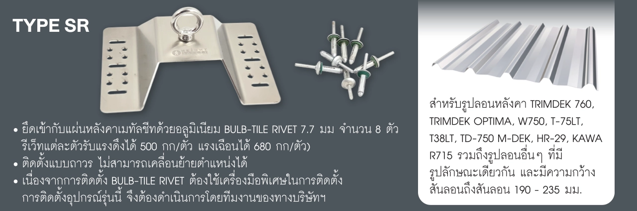 หากแผ่นหลังคาเป็นรูปลอนที่ยึดด้วยสกรู ROOF SEIF® จะออกแบบให้ติดตั้งด้วย Bulb-tile Rivet ขนาด 7.7 มม. จำนวน 8 ตัว ซึ่งสามารถรับแรงได้ตามมาตรฐาน EN 795 พร้อมระบบป้องกันการรั่วซึมดังนี้: